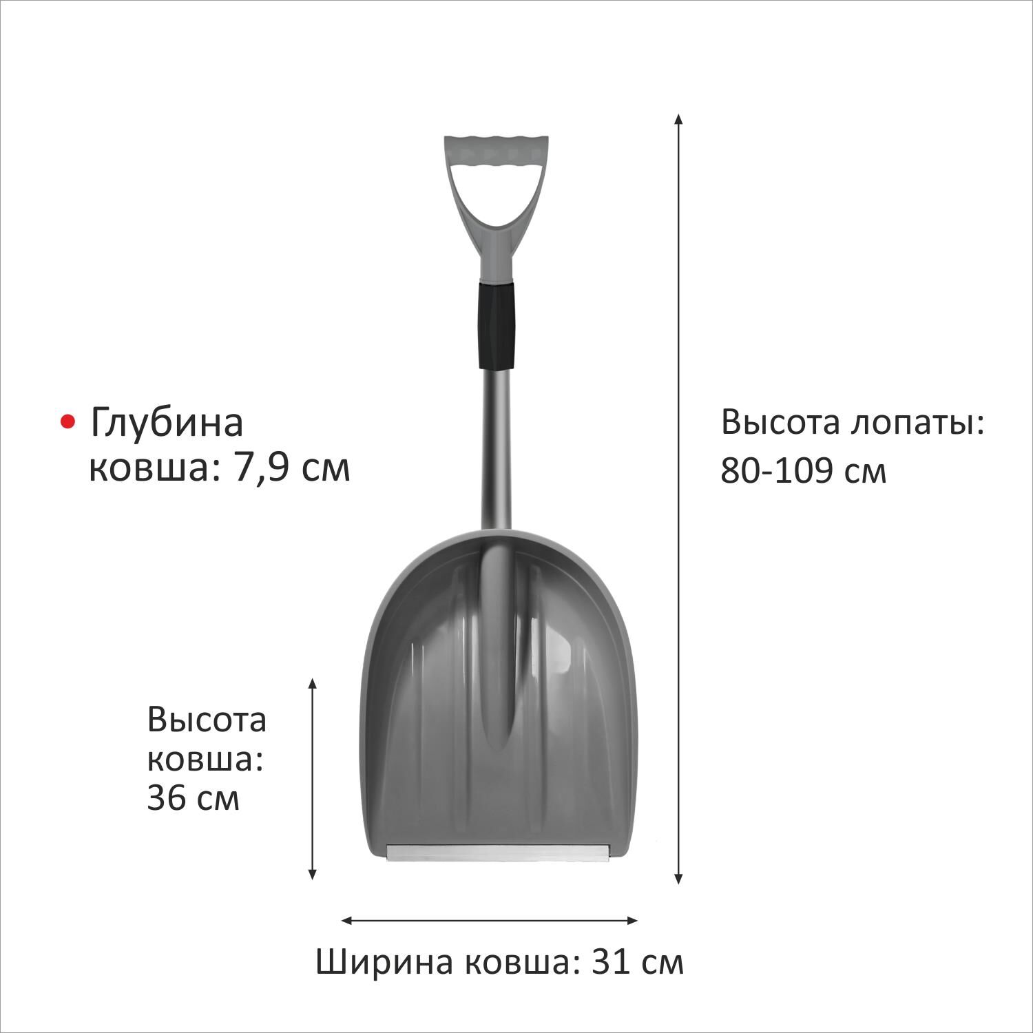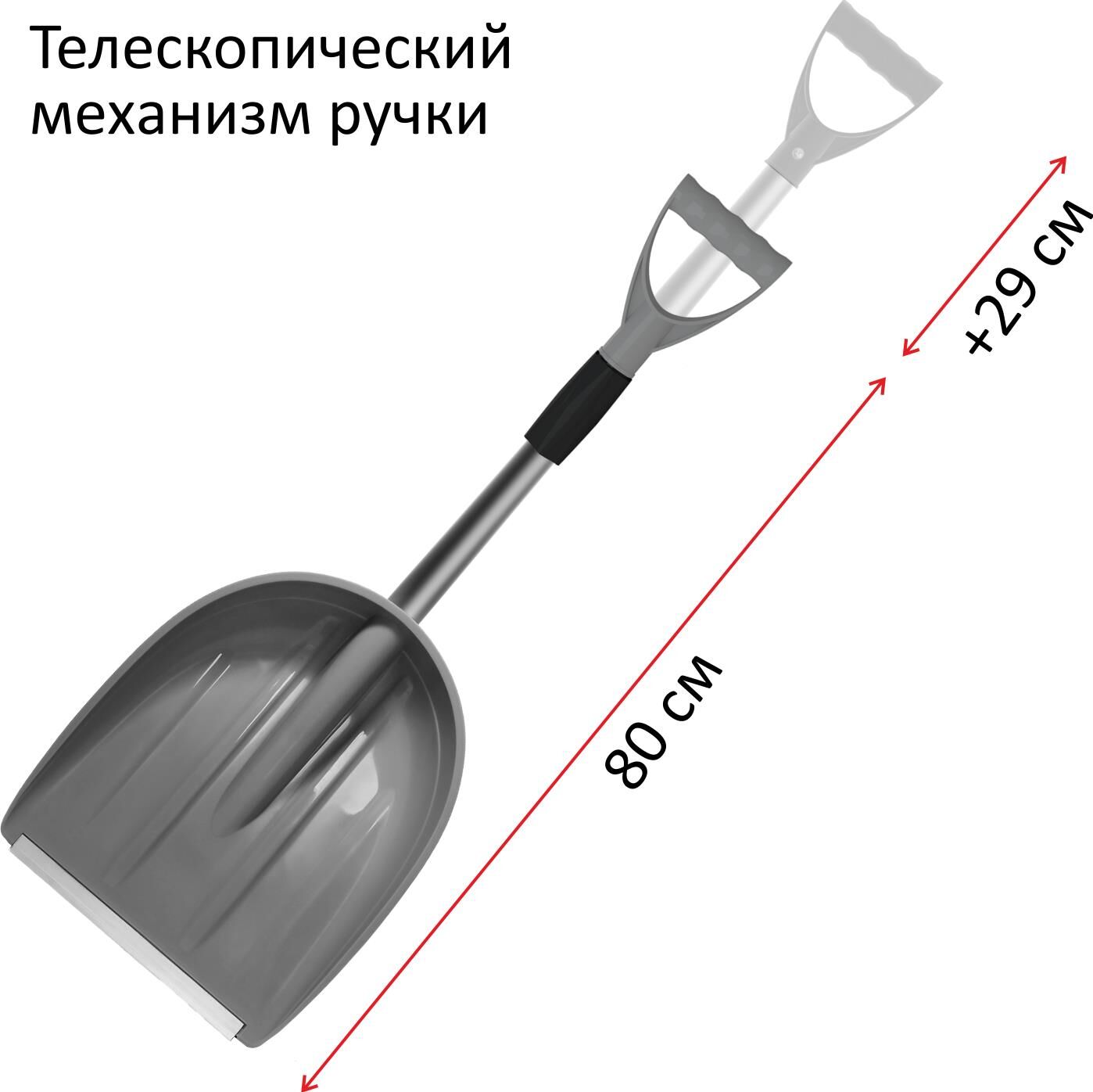 Благодаря компактному размеру и легкому весу снегоуборочная лопата удобна в использовании. Прочный алюминиевый черенок оснащен телескопическим механизмом с плотным фиксатором, который удерживает заданную длину ручки во время эксплуатации. Длина лопаты в сложенном виде - 80 см, в разложенном - 109 см. Снегоуборочная лопата эффективна как для уборки снега в ограниченных пространствах (на парковке между машинами) так и на больших территориях. В сложенном виде автомобильная лопата не занимает много места в багажнике и ее удобно возить с собой. Лопата снеговая LUCKY WAY удобна в использовании: V-образная рукоять обеспечивает комфортный хват. Неломающийся ковш из первичного полипропилена увеличенной глубины Черенок с телескопическим механизмом (регулируемая длина 80-109 см) Эргономичная V-образная рукоять обеспечивает удобный хват Алюминиевый скребок Длинна лопаты: 80-109 см Вес лопаты: 0,6 кг Габариты ковша: 31х36х7,9 см Материал ковша: полипропилен/алюминий Материал черенка: алюминий Тип рукояти: V-образный Материал рукояти: полипропилен