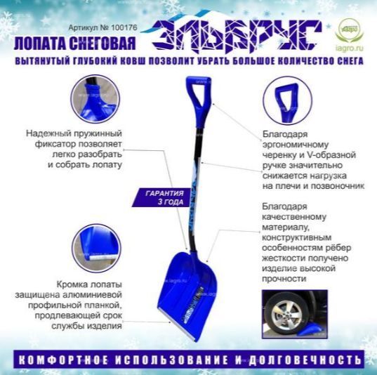 Габариты: 0,09 X 0,4 X 1,42 м Вес: 1.1 кг Ковш лопат изготовлен из первичного блоксополимера пропилена спец. марки. Используемый суперконцентрат "Ультрамариновый" придаёт яркий внешний вид лопате. Благодаря качественному материалу получено изделие высокой прочности. Кромка лопаты защищена спец. алюм. профилем с небольшим закруглением по краю. Это позволяет легче убирать снег, где территория не очень ровная. Несмотря на среднюю ширину 400 мм, лопата имеет вытянутый глубокий ковш, позволяющий убирать большое количество снега. Работать данной лопатой будет удобно за счет алюминиевого черенка, снижающего нагрузку на позвоночник. Сам черенок изготовлен из алюм. профиля, окрашенного порошковой окраской, что позволило значительно снизить вес лопаты в сборе и избежать свойства алюминия пачкаться во время соприкосновения с ним. Лопатный черенок заканчивается эргоном. и крепкой V-образной ручкой.