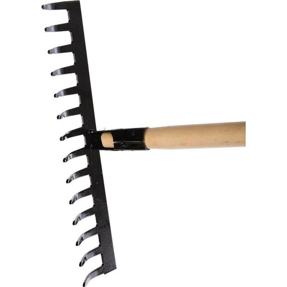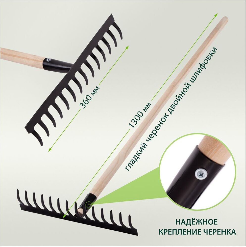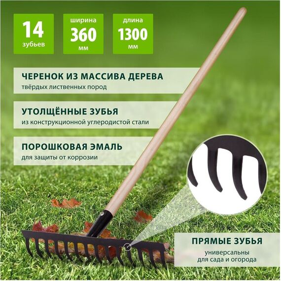 Грабли стальные, 360х1300 мм, 14 прямых зубьев, деревянный черенок 61742 Количество зубьев: 14 Сечение зубьев: прямой зуб Длина: 1300 мм Материал рабочей части: конструкционная сталь Материал черенка: древесина твердых пород Ширина рабочей части: 360 мм