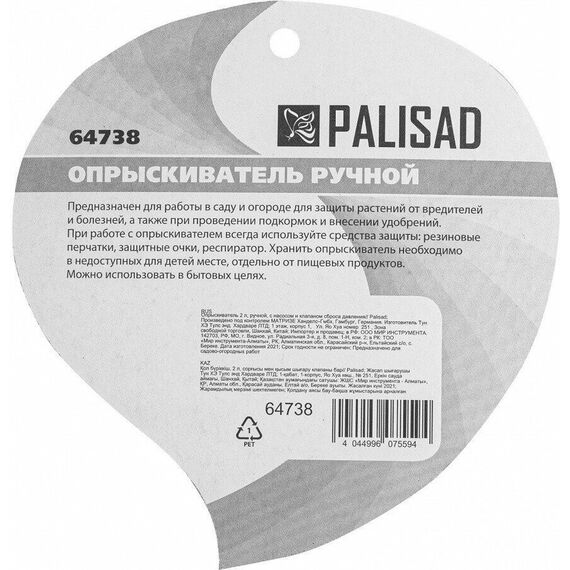 Опрыскиватель PALISAD Опрыскиватель ручной, 2 л, с насосом и клапаном сброса давления 64738