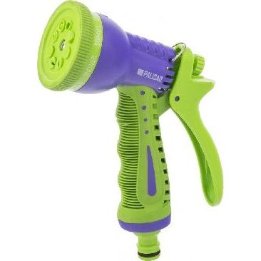 Пистолет-распылитель со штуцерной посадкой и курком, расположенным сзади. Оснащен регулируемой форсункой, что обеспечивает шесть режимов полива: душ, туман, конусную струю, центральную струю, плоско-горизонтальную струю, жесткую струю. Имеет фиксатор курка для непрерывной работы. Предназначен для всех типов полива на дачных участках, в садах, парках и скверах, а также для очистки. Совместим со всеми элементами системы полива Palisad и Palisad Luxe. Корпус и курок пистолета изготовлены из прочного АБС-пластика, рукоятка залита резиной, что обеспечивает максимальный комфорт при работе с инструментом.