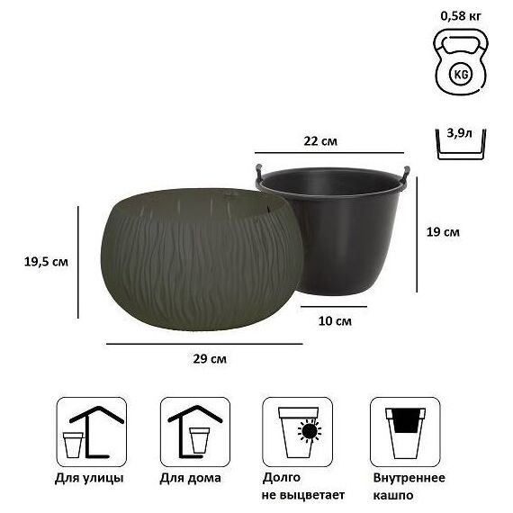 Кашпо для цветов Sandy Bowl является замечательным украшением садового интерьера, дома, зоны отдыха. Оно обладает повышенной стойкостью к высоким и низким температурам, а также к различным механическим повреждениям. Кашпо для цветов Sandy Bowl состоит из двух предметов: внутренней емкости, куда сажают растение, и декоративной емкости. • Комплектация: 2 предмета (внутренняя емкость + декоративная емкость) • Размер (ДМхВ): 290х190 мм • Объем: 3,9 л • Цвет: серый • Материал: пластик • Вес брутто: 0,58 кг • Количество в упаковке: 4 штуки • Производитель: Prosperplast • Страна: Польша