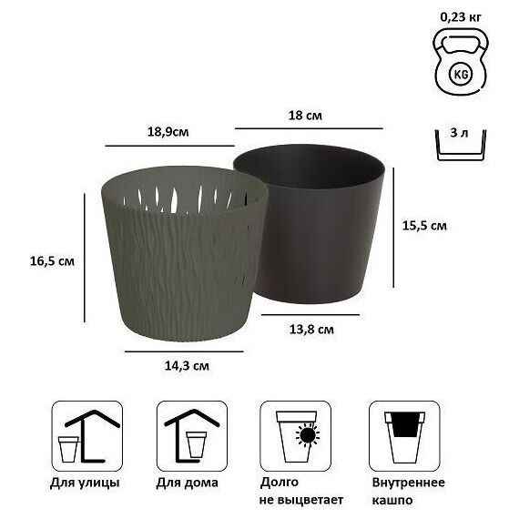 Кашпо для цветов Sandy Round является замечательным украшением садового интерьера, дома, зоны отдыха. Благодаря прочному пластику изделие обладает устойчивостью к ультрафиолетовым лучам. Кашпо для цветов Sandy Round состоит из двух предметов: внутренней емкости, куда сажают растение, и декоративной емкости. • Комплектация: 2 предмета (внутренняя емкость + декоративная емкость) • Размер (ДМхВ): 189х165 мм • Объемы: 3 л • Цвет: серый • Материал: пластик • Вес брутто: 0,225 кг • Количество в упаковке: 5 штук • Производитель: Prosperplast • Страна: Польша