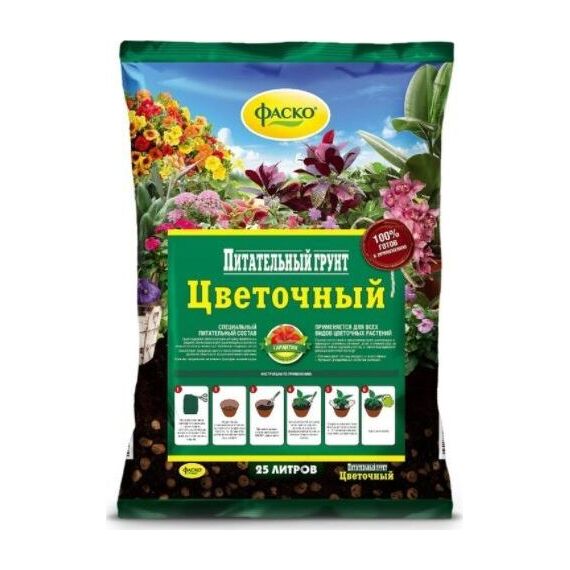 ФАСКО Грунт для цветов Цветочный 25л Идеальное соотношение питательных веществ в легкодоступной форме Способствует развитию корневой системы Не содержит патогенной микрофлоры Не содержит жизнеспособных семян сорняков Эффективность подтверждена тестами Рекомендуется профессиональными цветоводами Описание Грунт для цветов Фаско Цветочный является экологически чистым и питательным грунтом, который полностью готов к эксплуатации. Основа состоит из качественного торфа с добавлением всех необходимых минеральных удобрений. Благодаря пропорциональному и особому составу, данный грунт способен обеспечить здоровый и активный рост растениям, стимулировать прорастание семян, а также повысит их устойчивость к болезням! Рекомендации по применению Для выращивания и пересадки цветов, а также для посадки луковичных растений в открытый грунт. Состав Верховой торф, низинный торф, песок, известняковая (доломитовая) мука, комплексное минеральное удобрение с микроэлементами.