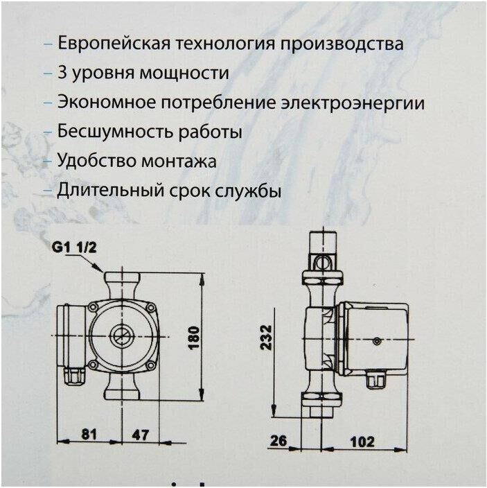 Циркуляционный насос с мокрым ротором (без провода), Максимальная высота подъема жидкости 2 м, максимальный проток жидкости 30 л/мин, максимальная мощность 60 Вт, установочное расстояние между фитингами 180 мм, керамический вал и подшипники, медная обмотка двигателя