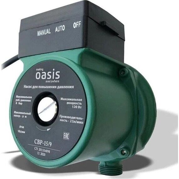 Максимальная мощность, Вт 120. Параметры электросети, В/ Гц 220/50. Производительность, л/мин 30. Максимальный напор, м 9. Максимальное рабочее давление, бар 6. Диаметр разъема соединения, мм 15. Максимальная температура жидкости, С 110. Класс защиты IP44. Монтажная длина, мм 160. Вес нетто, кг 2,6 | 2,5.