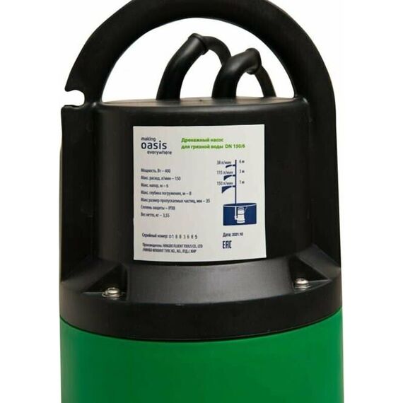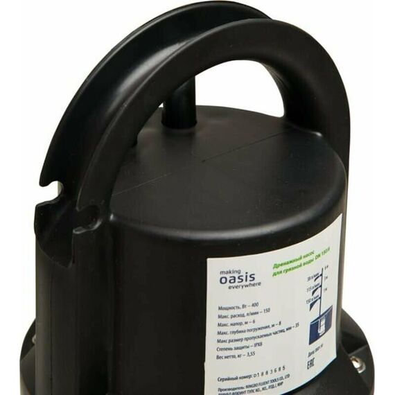 Мощность, Вт - 400. Макс. расход, л/мин - 150. Макс. напор, м - 6. Макс. глубина погружения, м - 8. Макс. размер пропускаемых частиц, мм - 35. Материал корпуса насоса - Пластик. Длина кабеля, м - 10. Материал крыльчатки - Пластик. Габаритные размеры, см - 17х15,8х31,3.