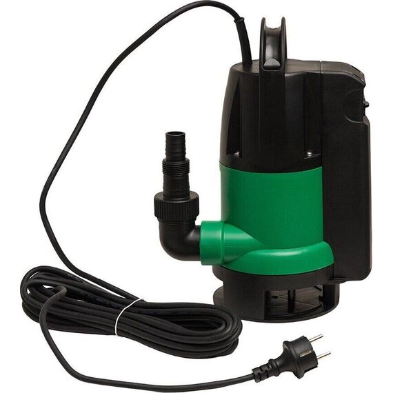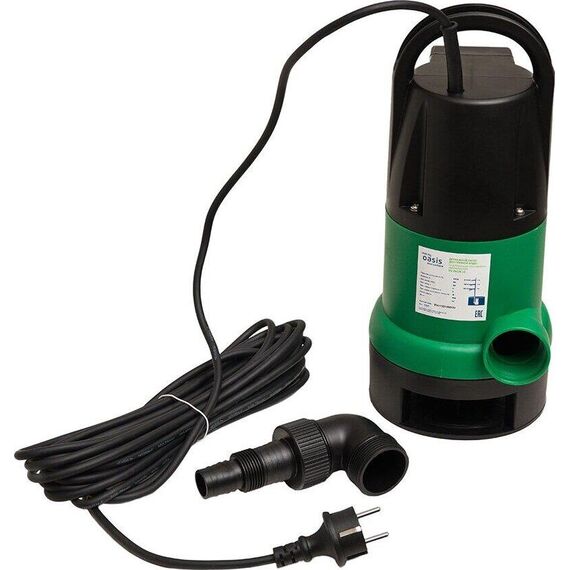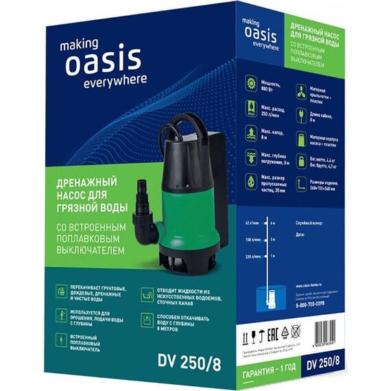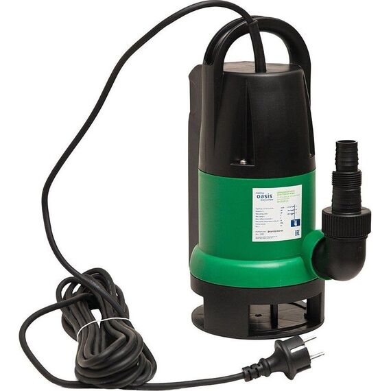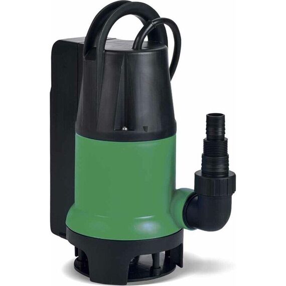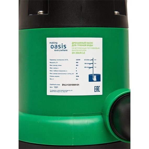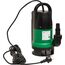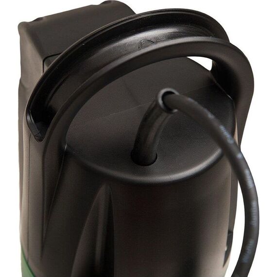 Насос дренажный для грязной воды, мощность 880 Вт, максимальный напор 8 метров, максимальный расход 250 л/мин, максимальный размер пропускаемых частиц 35 мм, максимальная глубина погружения 8 метров, материал корпуса пластик, встроенный поплавок