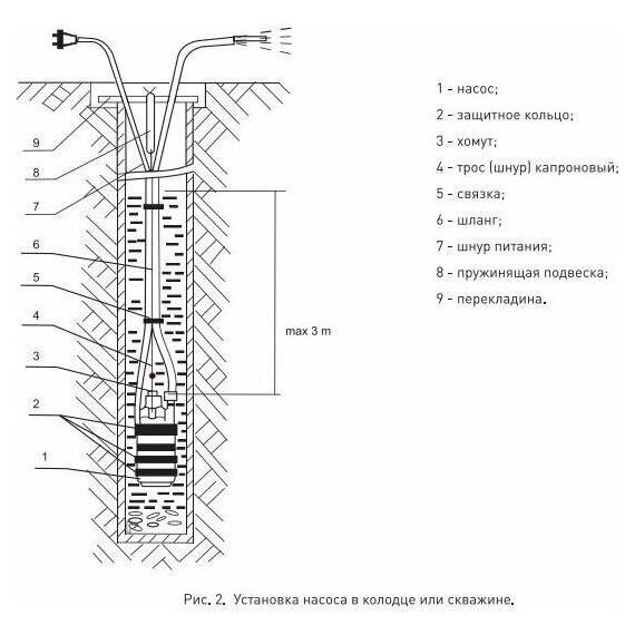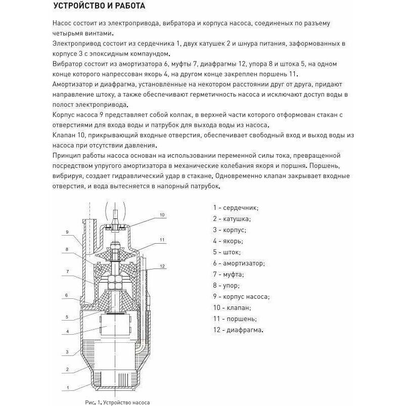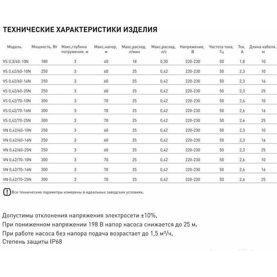 Насос вибрационный, нижний забор воды, мощность 300 Вт, максимальный напор 70 метров, максимальный расход 25 л/мин, длина кабеля 25 метров