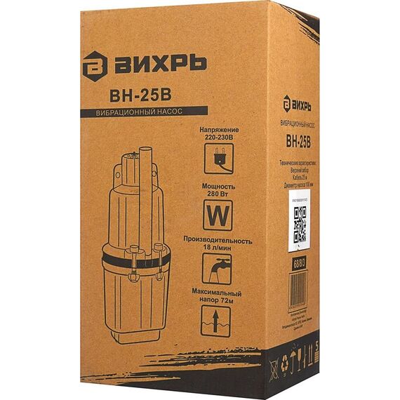 Высота подъема, м 72. Глубина погружения, м 3. Забор воды верхний. Мощность, Вт 280. Производительность, л/мин 18. Трубное соединение, дюйм елочка 3/4. Тип колодезный. Диаметр насоса, мм 100. Длина кабеля, м 25. Вид погружной. Защита от сухого хода нет. Мах температура жидкости, °С 35. Min уровень воды, мм 600. Соединитель в комплекте нет. Допустимая температура жидкости, °С +35°C. Класс защиты IPX8. Напряжение, В 220. Материал корпуса алюминиевый сплав. Серия ВН. Конструкция вибрационный.