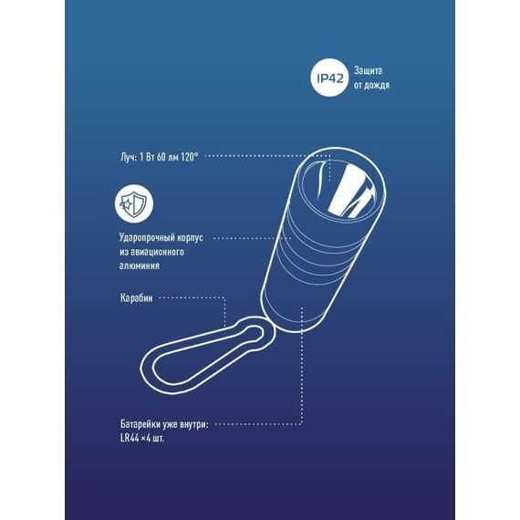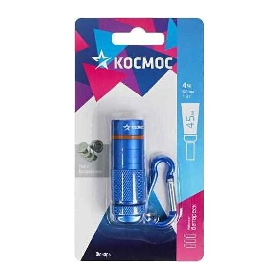Карманный фонарь-брелок КОСМОС (KOC205B) с карабином в прочном корпусе из анодированного алюминия. Легкий и маленький корпус – легко носить вместе с ключами и документами. Батарейки уже внутри. Луч фонаря – светит вперед, направленный свет. Источник света: 1 Вт SMD LED; Источник питания: 4xLR44 (входят в комплект); Количество режимов: 1 (луч); Световой поток: 60 лм.; Дистанция освещения: 45 м.; Корпус: анодированный алюминий, IP42; Компактный карманный размер: 5.5x2.0x2.0 см.; Карабин.