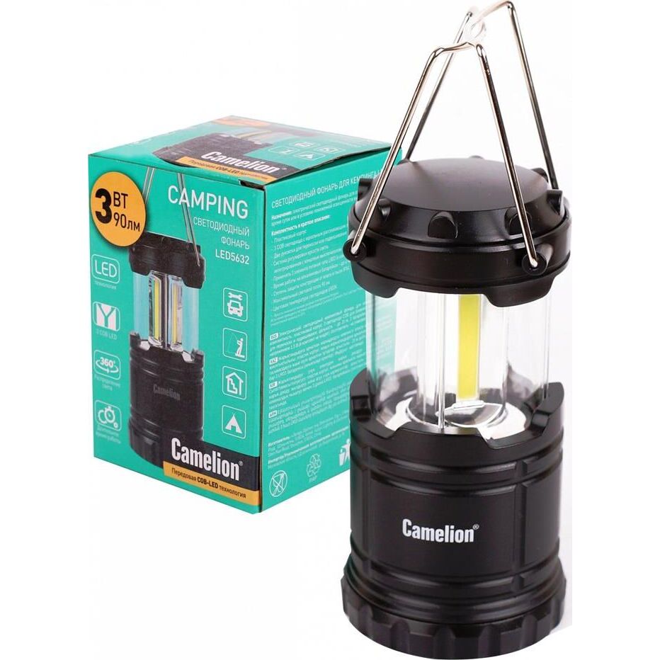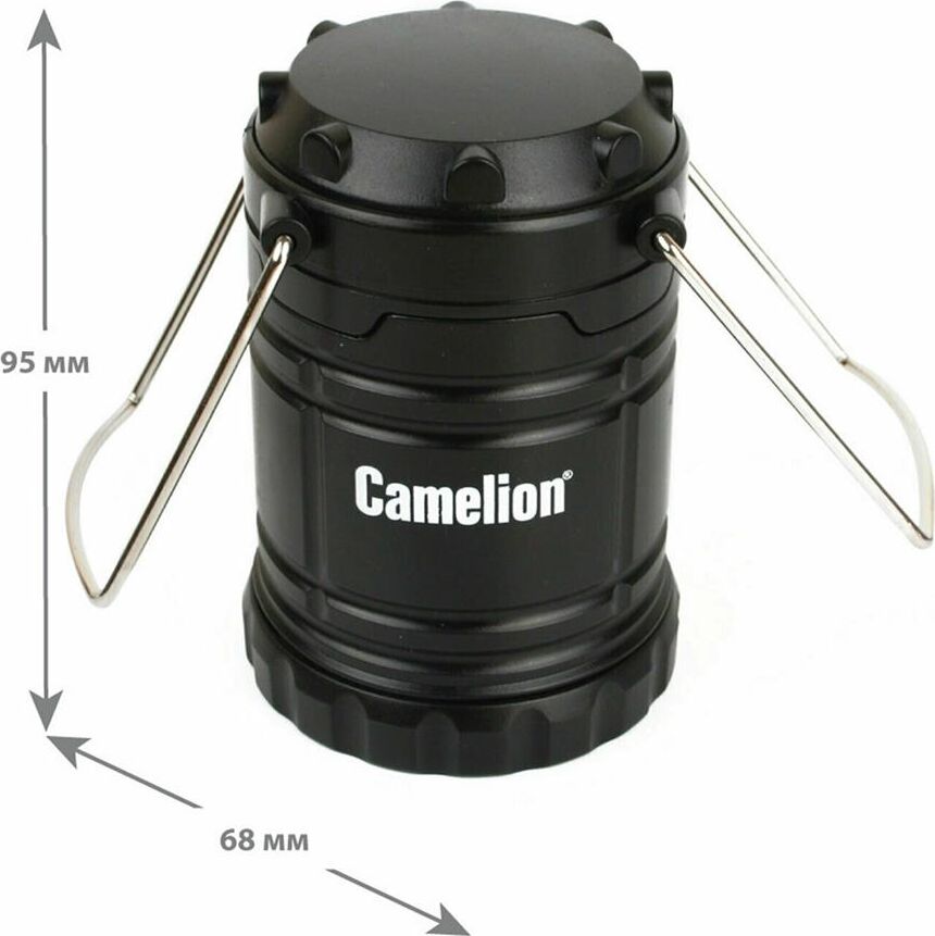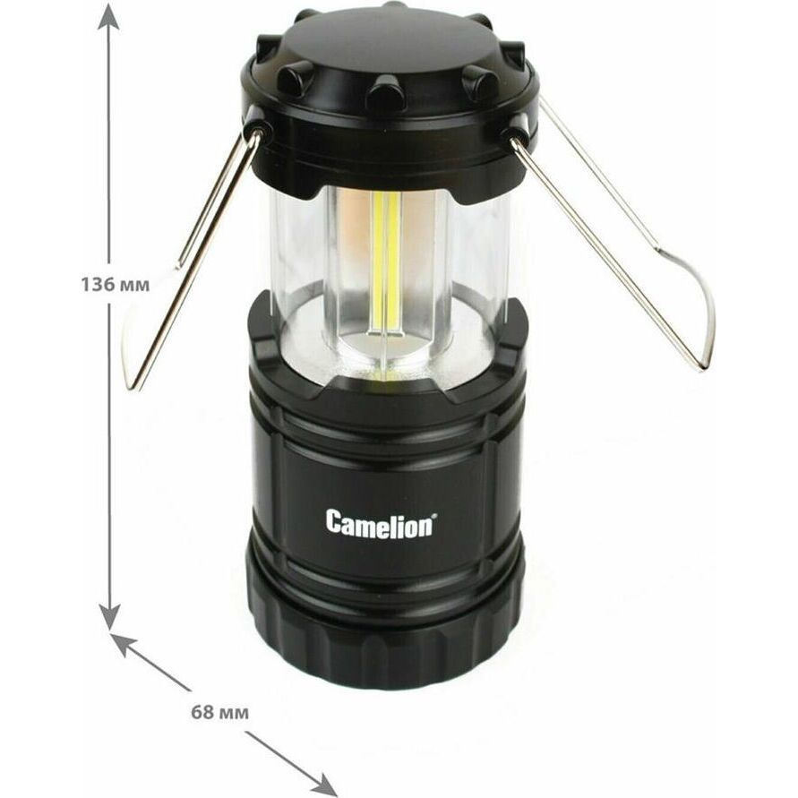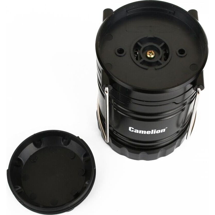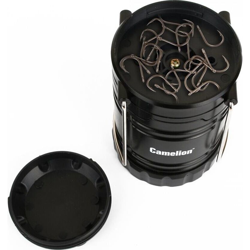 Фонарь Camelion электрический светодиодный кемпинговый. Цвет корпуса - черный. Источники света - 3 COB светодиода с цветовой температурой 6500К и максимальным суммарным световым потоком 90 люмен. Дистанция освещения - до 20 метров. Время работы - до 4 часов. В комплекте: встроенные в дно крючок для подвешивания и четыре круглых магнита для крепления к металлическим поверхностям, контейнер (под верхней крышкой) для хранения мелких полезных предметов.