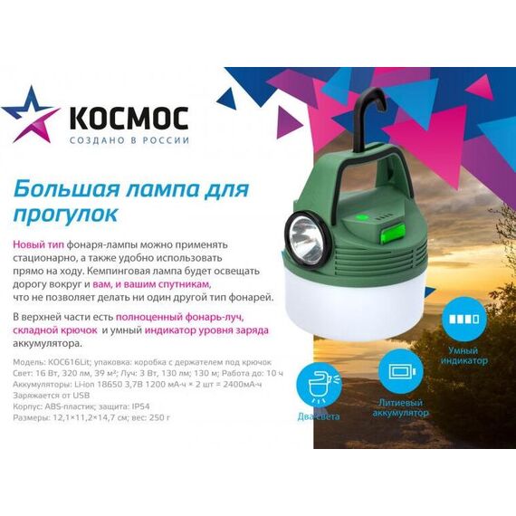 Кемпинговая фонарь-лампа для прогулок КОСМОС (KOC616Lit). Новый тип фонаря-лампы можно применять стационарно, а также удобно использовать прямо на ходу. Кемпинговая лампа будет освещать дорогу вокруг и вам, и вашим спутникам, что не позволяет делать ни один другой тип фонарей. В верхней части есть полноценный фонарь-луч, складной крючок, умный индикатор уровня аккумулятора и гнездо для заряда мобильных устройств. Источник света: кемпинговая лампа 16Вт SMD LED; луч 3Вт LED; Источник питания: Li-ion аккумуляторы 18650 3,7В 2400 мА/ч (встроенные), индикатор уровня заряда, зарядный USB-шнур в комплекте, функция power bank; Количество режимов: 3 (луч яркий/круговой кемпинговый свет яркий, экономичный); Световой поток: 320 лм. (круговой кемпинговый свет)/ 130 лм. (луч); Дистанция освещения: 39м2 (круговой кемпинговый свет)/ 130 м. (луч); Корпус: ABS-пластик; IP54; Размер: 12x12x14.3 см.