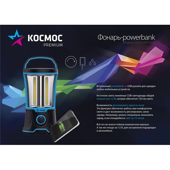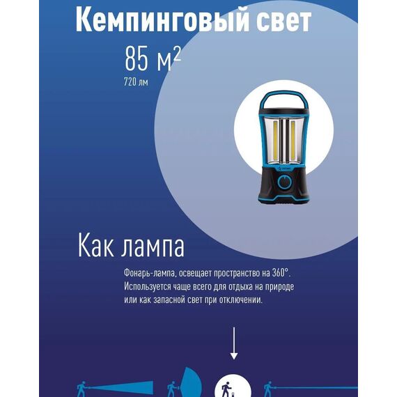 Кемпинговый фонарь-лампа, с линейными COB-светодиодами повышенной мощности и возможностью регулировки яркости света. Свет на 85 кв.м. осветит целый палаточный лагерь. Функция Power bank от фонаря можно подзарядить телефон. Кемпинговый свет - освещает все пространство вокруг себя и часто используется в местах отдыха. Площадь освещения - 85 кв.м, время беспрерывной работы 6-13 ч. Надежный свинцово-кислотный аккумулятор 4В 2000 мАч, подзарядка от сети. Упакован в коробку с подробной информацией о модели и схемой фонаря.