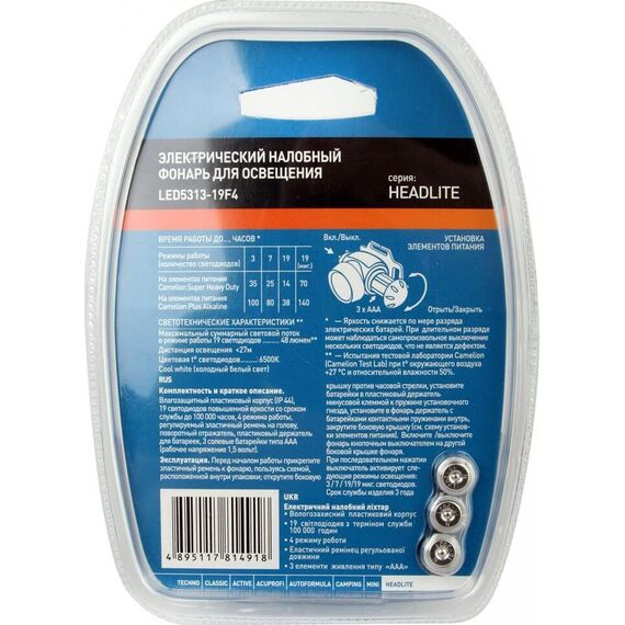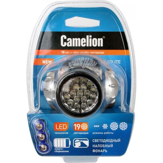 Фонарь CAMELION LED5313-19F4 (фонарь налобн, металлик, 19LED, 4 реж, 3XR03 в компл, пласт, блист)