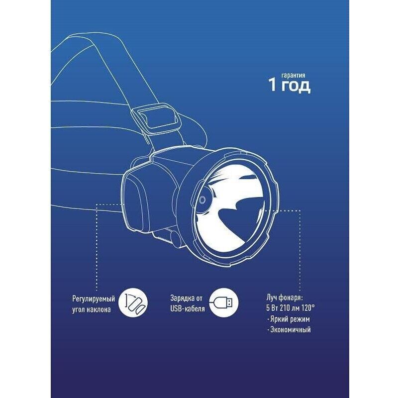 LED 5W 220лм 2режима, аккум.2Ah,зарядка от USB,провод в комплекте