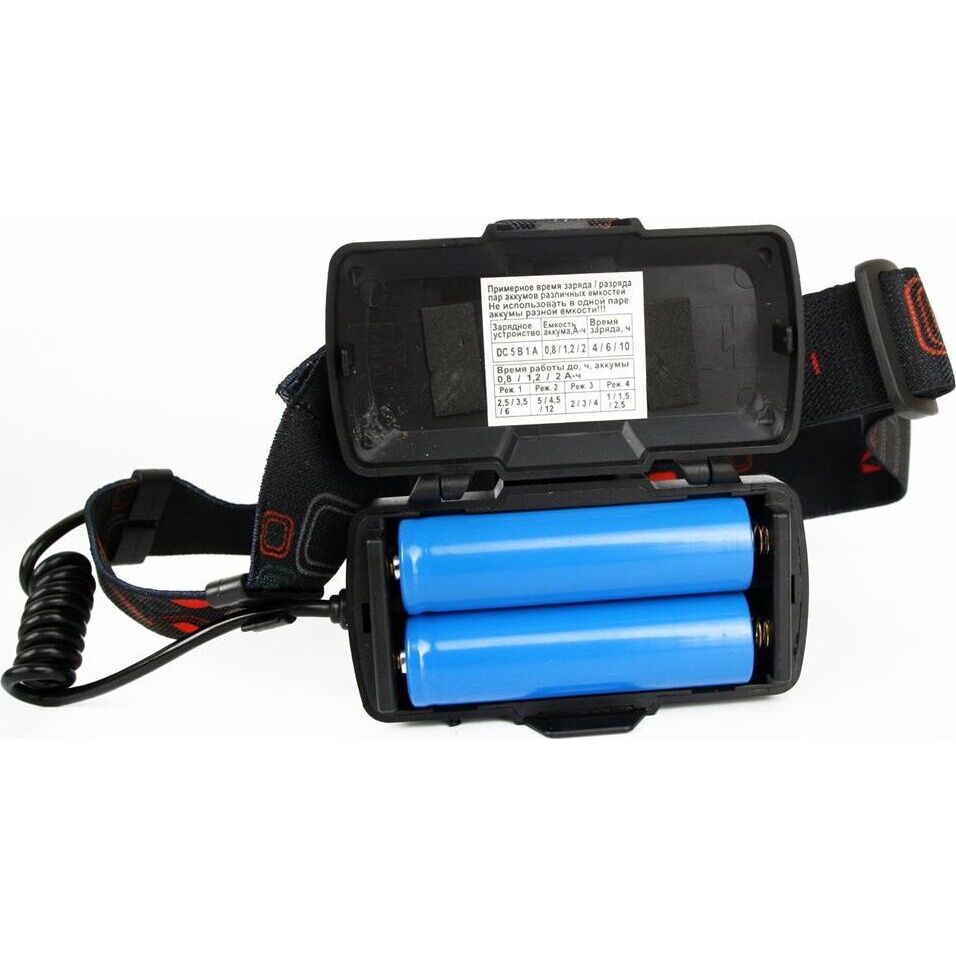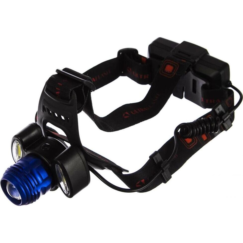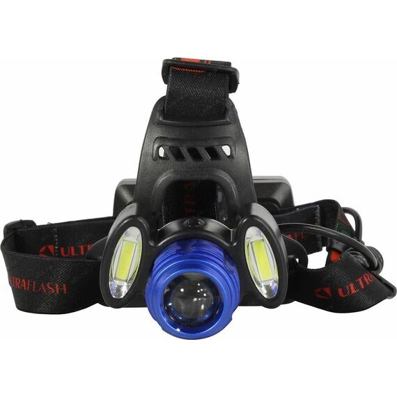 Фонарь Ultraflash электрический светодиодный налобный аккумуляторный. Цвет корпуса: синий / черный. Материал: корпуса фонаря - алюминиевый сплав / пластик. Источники света - светодиод XML-T6 с потребляемой номинальной мощностью 4 Вт, 2 светодиода типа COB с потребляемой мощностью 2 Вт. световой поток до 300 люмен. Дистанция освещения - до 250 метров. Регулируемый фокус (ZOOM). 4 режима работы - XML-T6 / 2 боковых COB LED / все LED BOOST / мигалка. Возможность работы и от одного, и от двух аккумуляторов. Возможность работы напрямую от Powerbank через вход Micro USB. Индикатор заряда, меняющий цвет при окончании заряда. Выключатель: четырехпозиционный кнопочный. Время работы при полностью заряженном аккумуляторе (для емкости 1200 мА-ч): : в режиме XML-T6 - до 3,5 часов, в режиме 2 X COB - до 4,5 часов, все LED - до 3 часов, мигающий режим - до 1,5 часов. Заряд через вход Micro USB при помощи распространенных зарядных устройств для телефонов с Андроидом. Время заряда (ток заряда 1А, аккумуляторы 1200 мА-ч) - 6 ч