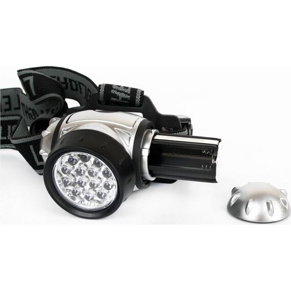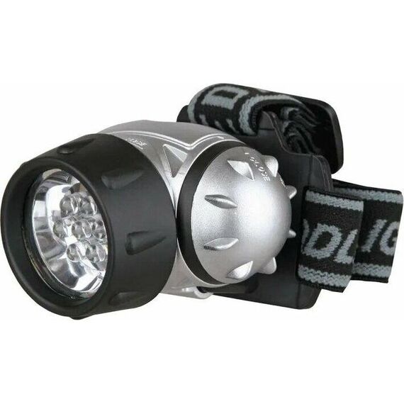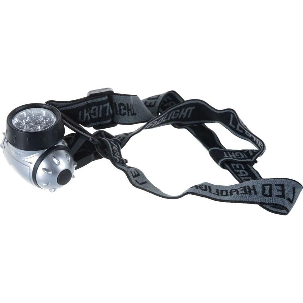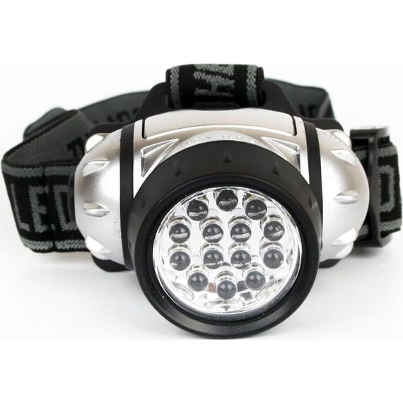 Фонарь электрический светодиодный налобный. Цвет корпуса: серебро + чёрный. Работает от 3 X AAA батареек (не входят в комплект). Материал корпуса - пластик. Источник света - 14 светодиодов с рассеивающими линзами с цветовой температурой 6500К со световым потоком 30 люмен. Дистанция освещения - до 20 метров. Четыре режима работы. Выключатель -четырёхпозиционный кнопочного типа. Время работы при использовании солевых батареек: 4 светодиода - до 33 часов, 8 светодиодов - до 22 часов, 14 светодиодов - до 18 часов, 18 светодиодов в мигающем режиме - до 80 часов. Степень пыле-влаго-защиты IP44.
