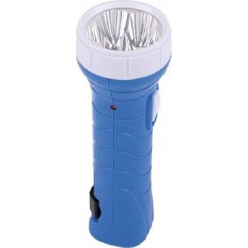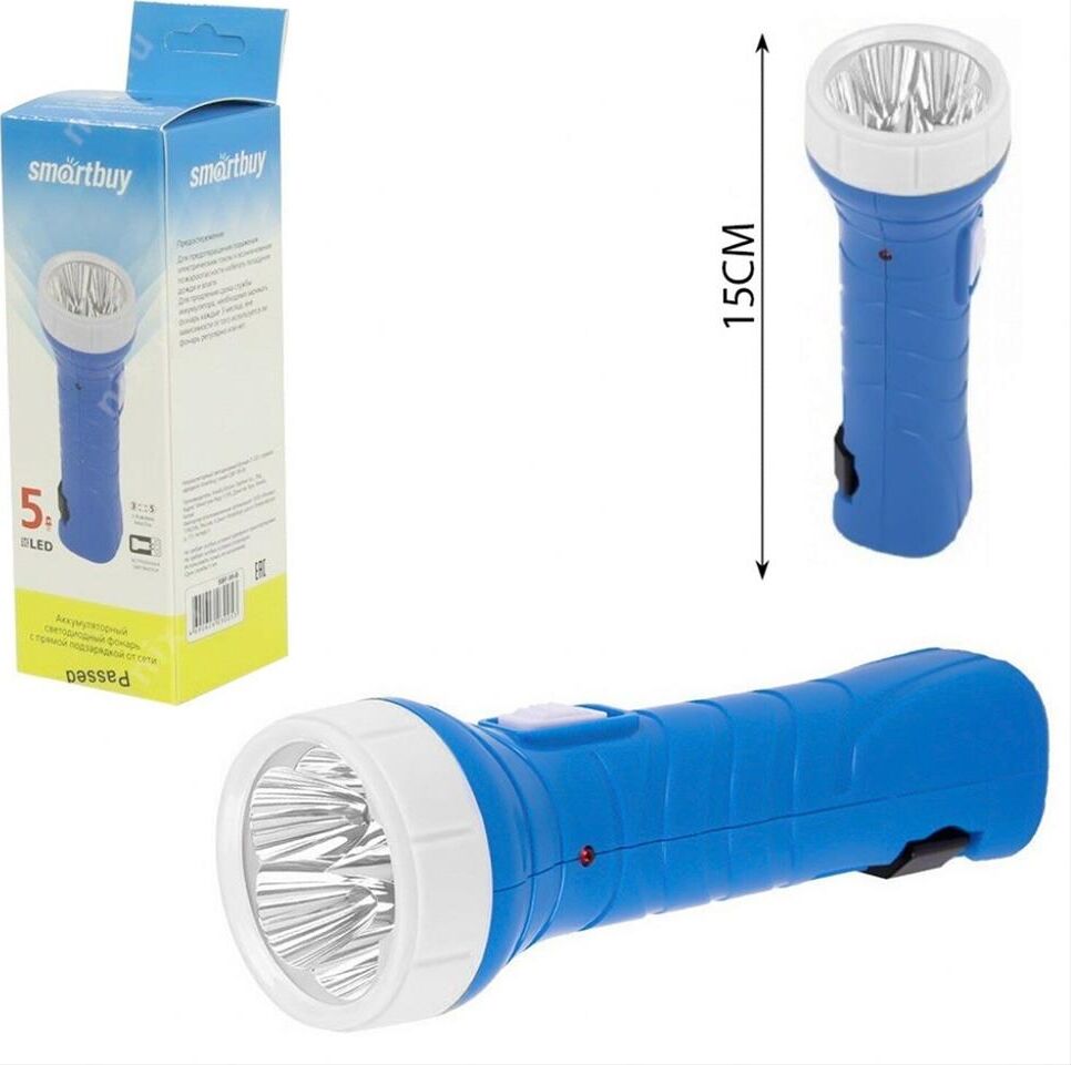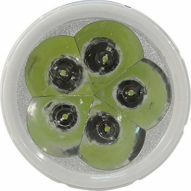 Аккумуляторный светодиодный фонарь с прямой зарядкой, источник света: 5 LED, отражатель: зеркальный, материал корпуса: пластик/металл.