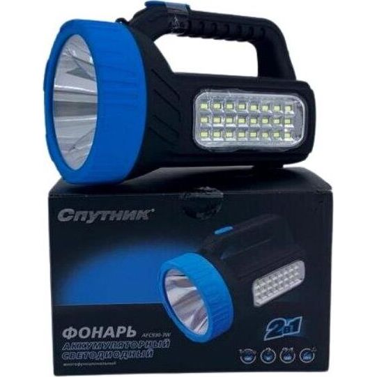 AFP930-3W прожектор+светильник / 1 LED мощностью 3 Вт + 24 SMD LED мощностью 4,8 Вт / аккумулятор 1200 mAh 4V / время заряда: 12-14 ч / время непрерывной работы: до 5 ч / материал корпуса: пластик с каучуковым напылением / цвет корпуса: чёрный/голубой / индивидуальная цветная коробка