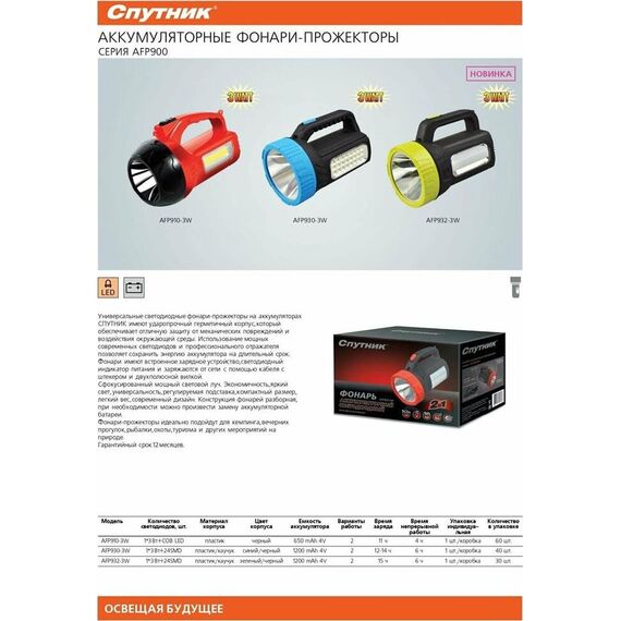 AFP932-3W прожектор+светильник / 1 LED мощностью 3 Вт + 24 SMD LED мощностью 4,8 Вт / аккумулятор 1200 mAh 4V / время заряда: 15 ч / время непрерывной работы: до 6 ч / материал корпуса: пластик с каучуковым напылением / цвет корпуса: чёрный/зелёный / индивидуальная цветная коробка
