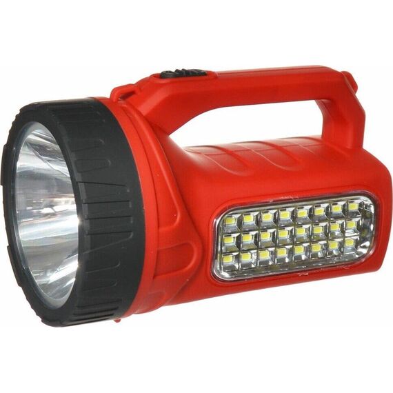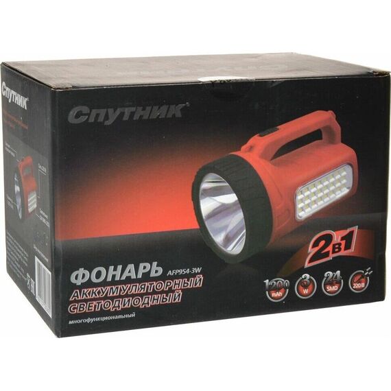 AFP954-3W прожектор+светильник / 1 LED мощностью 3 Вт + 24 SMD LED мощностью 4,8 Вт / аккумулятор 1200 mAh 4V / время заряда: 15 ч / время непрерывной работы: 4-5 ч / материал корпуса: пластик с каучуковым напылением / цвет корпуса: красный/чёрный / индивидуальная цветная коробка