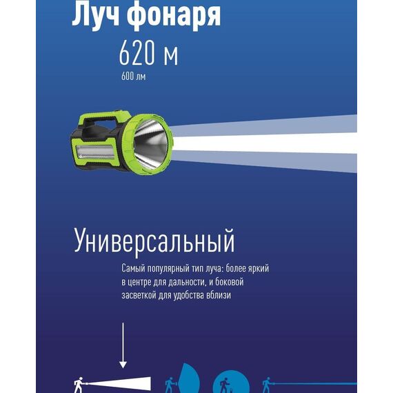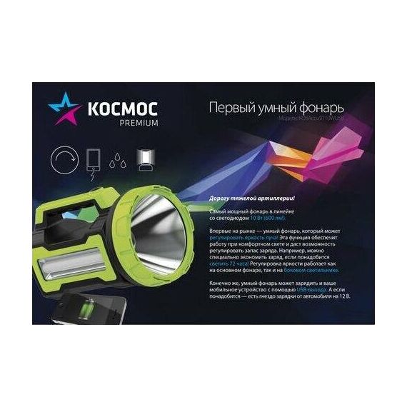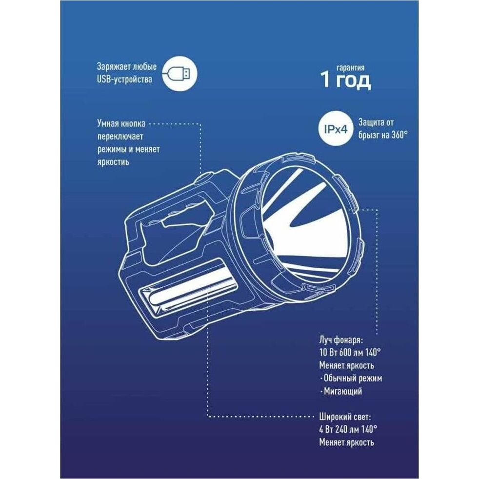 УМНЫЙ МОЩНЫЙ ФОНАРЬ со светодиодом 10 Ватт 600 лм, который может регулировать яркость луча Эта функция обеспечит работу при комфортном свете и даст возможность регулировать запас заряда. Например, можно специально экономить заряд, если понадобится светить 72 часа. Регулировка яркости работает как на основном фонаре, так и на боковом светильнике мощностью 240 лм. Дальность луча фонаря 620 метров. Широкий свет осветит 29 кв.м.. Умный фонарь может зарядить и Ваше мобильное устройство с помощью USB-выхода. Гнездо зарядки от автомобиля на 12В. Ударопрочный. Влагостойкий корпус