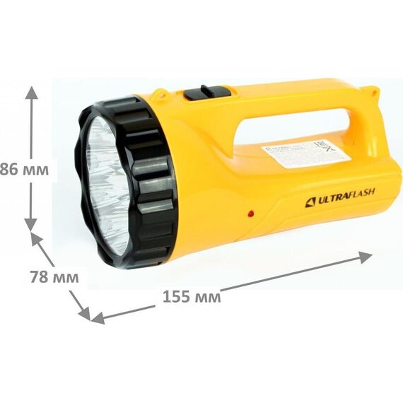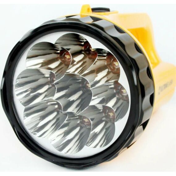Фонарь электрический светодиодный аккумуляторный. Цвет корпуса: желтый + черный. Материал корпуса - пластик. Источник света - 9 светодиодов в индивидуальных отражателях со световым потоком 30 люмен. Дистанция освещения - до 28 метров. Два режима работы. Выключатель -тумблер. Время работы при полностью заряженном аккумуляторе: 100% яркости - до 5,5 часов, 50% яркости - до 18 часов. Заряд напрямую от сети ~220 вольт. Время заряда 12 ч. Степень пыле-влаго-защиты IP22.