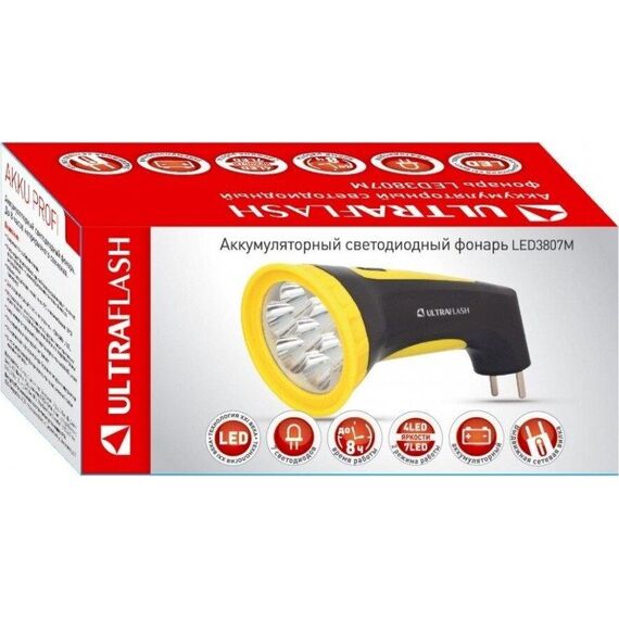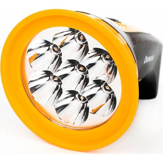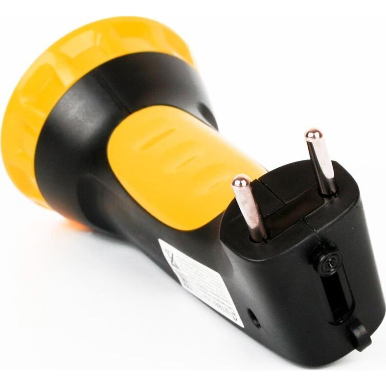Фонарь электрический светодиодный аккумуляторный. Цвет корпуса: черный + желтый. Материал корпуса - пластик. Источник света - 7 светодиодов в индивидуальных отражателях со световым потоком 25 люмен. Дистанция освещения - до 25 метров. Два режима работы. Выключатель - тумблер двухпозиционный. Время работы при полностью заряженном аккумуляторе: 4 светодиода - до 8 часов, 7 светодиодов - до 4 часов. Заряд напрямую от сети ~220 вольт. Время заряда 8 ч. Степень пыле-влаго-защиты IP22.