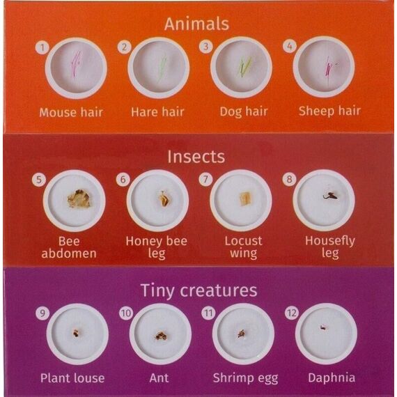 Набор микропрепаратов Levenhuk LabZZ CP24, существа и растения – это оригинально оформленные образцы для самостоятельных наблюдений, наглядные пособия по ботанике, зоологии и энтомологии. Всего в наборе 24 образца. Все микропрепараты подписаны и сгруппированы по темам: например, есть пластины «Животные», «Растения» и «Крошечные существа». Образцы оклеены цветной бумагой с круглыми прозрачными окошками. Весь набор упакован в фирменную коробку из прочного картона.