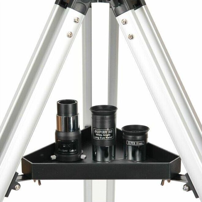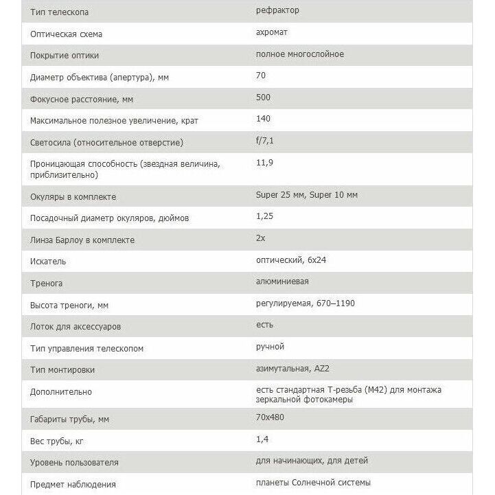 Тип телескопа рефрактор Оптическая схема ахромат Покрытие оптики полное многослойное Диаметр объектива (апертура), мм 70 Фокусное расстояние, мм 500 Максимальное полезное увеличение, крат 140 Светосила (относительное отверстие) f/7,1 Проницающая способность (звездная величина, приблизительно) 11,9 Окуляры в комплекте Super 25 мм, Super 10 мм Посадочный диаметр окуляров, дюймов 1,25 Линза Барлоу в комплекте 2x Искатель оптический, 6x24 Тренога алюминиевая Высота треноги, мм регулируемая, 670–1190 Лоток для аксессуаров есть Тип управления телескопом ручной Тип монтировки азимутальная, AZ2 Дополнительно есть стандартная Т-резьба (М42) для монтажа зеркальной фотокамеры Материал трубы алюминий Габариты трубы, мм 70x480 Вес трубы, кг 1,4 Уровень пользователя для начинающих, для детей Предмет наблюдения планеты Солнечной системы