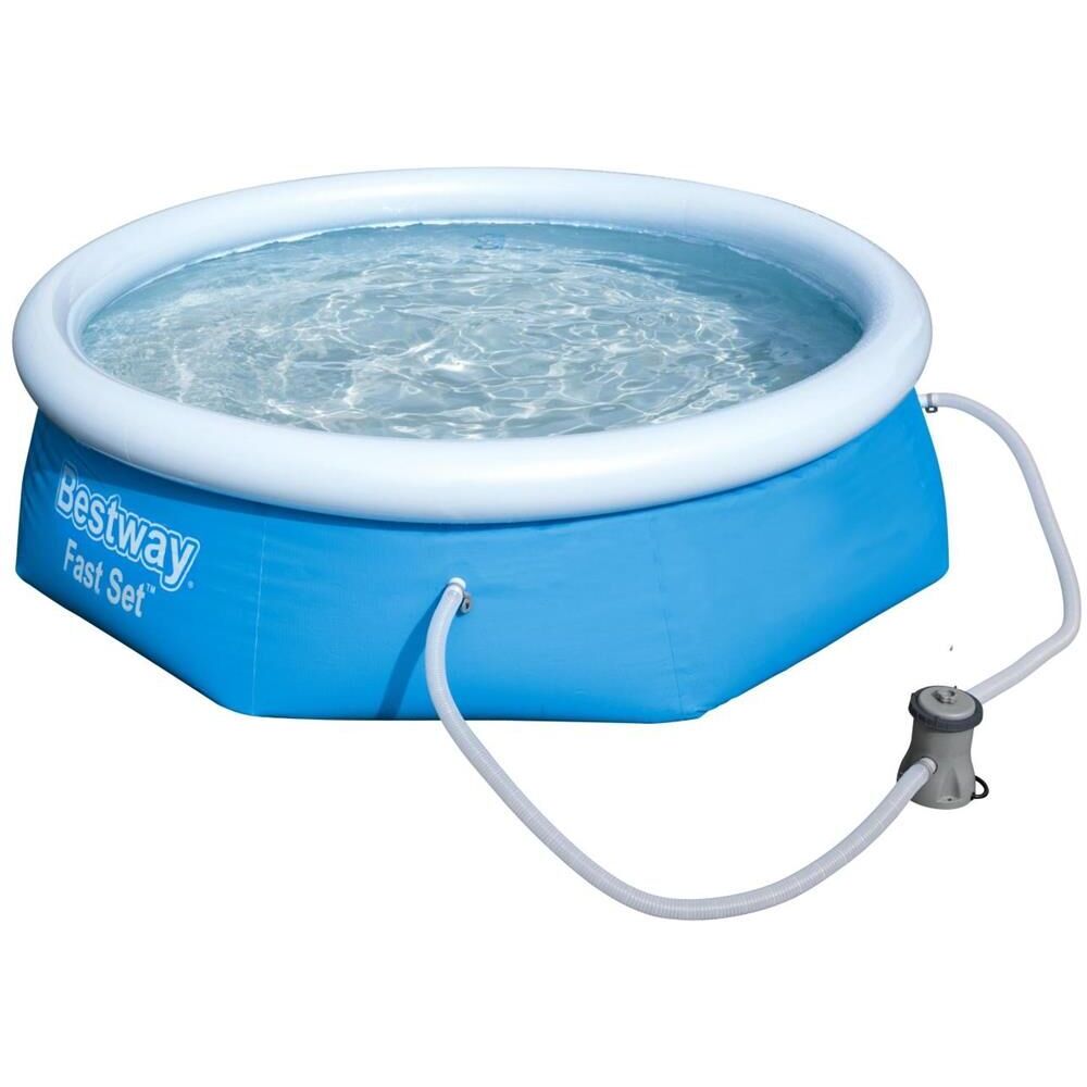 Бассейн с надувным бортом с ф.-насосом 244х66см, 2300 л, 57268 Bestway Надувной бассейн Bestway 57268/57100 Fast Set отличается простотой и легкостью. Стенки бассейна, выполнены из армированного ПВХ, внешний слой - полиэстер для особой прочности. Поддержка бортов осуществляется при помощи надувного кольца, которое поднимается по мере наполнения бассейна и расправляет его стенки. Для установки бассейна нужна плоская, горизонтальная площадка. Время сборки и подключения бассейна не более 10-15 минут. На холодное время года не рекомендуем оставлять бассейн на открытом воздухе. Удобный сливной клапан позволяет присоединить садовый шланг, что дает возможность слить воду в любое место. В комплекте имеется фильтр-насос для наполнения и рециркуляции воды в бассейне. Характеристики Объем: 2300 л Размер: 244х66 см Вес: 7,76 кг Насос-фильтр мощностью 1249 л/ч Комплектация Бассейн Фильтр-насос #58381/58145 Заплатка для ремонта Инструкция