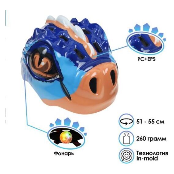 Шлем предназначен для детей. Размер окружности головы регулируется: 51-55 см. Корпус изготовлен из термопластика. В качестве буфера служит пенополистирол, который в случае падения принимает основную силу удара на себя. Подкладка из полиэфирного волокна предотвращает попадание грязи и влаги, не вызывает аллергических реакций. Имеются вентиляционные отверстия. В комплект входит съёмная подкладка для подбородка.Сзади шлем оснащён фонарём для обозначения велосипедиста на проезжей части.