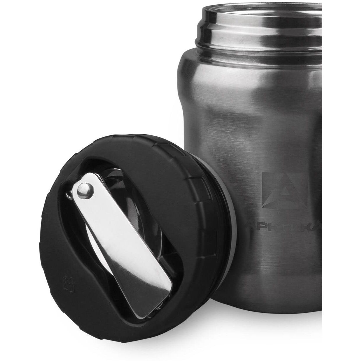 Термос для еды вакуумный, бытовой, тм «Арктика», 0.5 л, В комплект входит вместительная крышка-тарелка и складная ложка. Пробка оснащена кнопкой спуска избыточного давления в термосе. Самая легкая и компактная модель