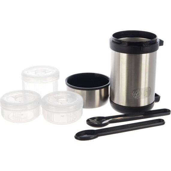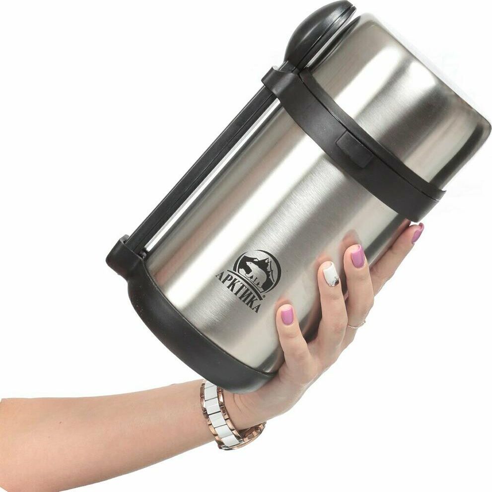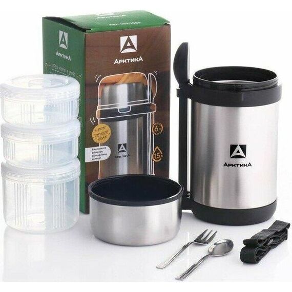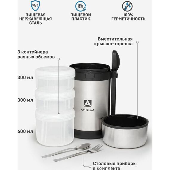 Термос с супершироким горлом, в комплекте 3 контейнера: 1-600 мл, 2 -300 мл, ложка+ вилка, съемный ремешок