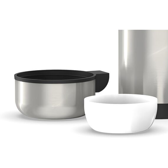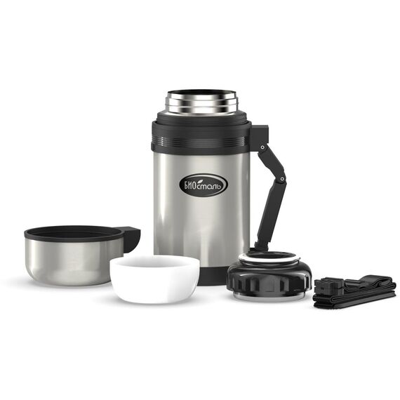 Термос универсальный 1.0 л. С удобной ручкой и ремешком для переноски. С крышкой-чашкой и дополнительной пластиковой чашкой. Изготовлен из высококачественной нерж. стали.