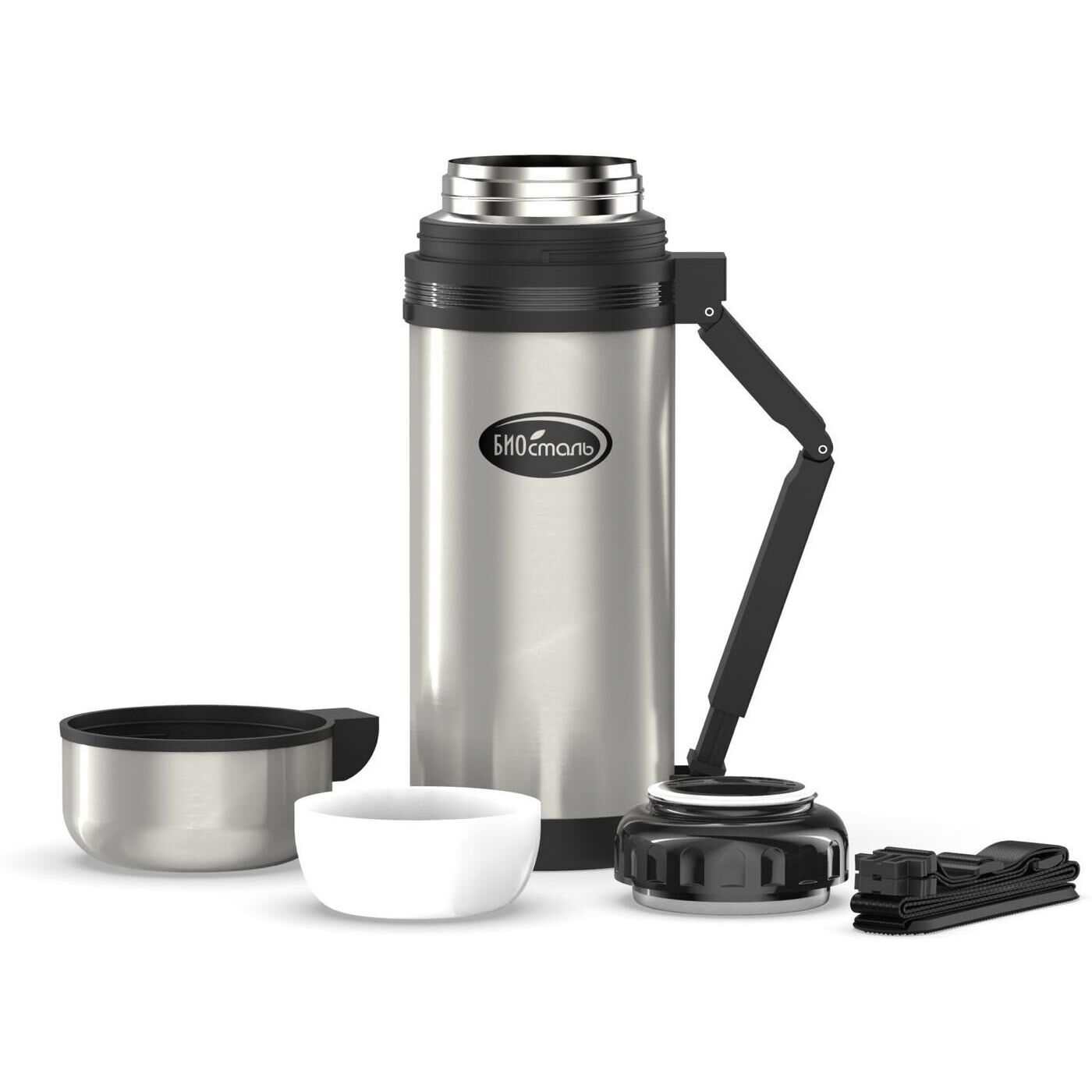 Термос универсальный 1.5 л. С удобной ручкой и ремешком для переноски. С крышкой-чашкой и дополнительной пластиковой чашкой. Изготовлен из высококачественной нерж. стали.