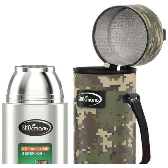 Термос из нержавеющей стали 18/8 (AISI 304) с ситечком для заваривания и пробкой-контейнером. Пробка с дополнительной изоляцией и функцией «термоконтроль» позволяет наливать напитки без полного откручивания пробки под любым углом. Ситечко из высококачественной нержавеющей стали 18/8. Дополнительная чашка из прочного пищевого пластика. Термочехол из прочной камуфляжной ткани защищает термос от повреждений и повышает его термозащиту.