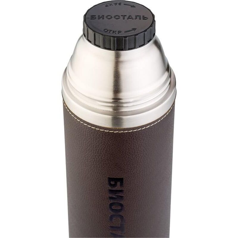 Термос "Биосталь-Охота" с узкой горл., кожан.вставкой 2 ПРОБКИ, объем: 1 л корпус из стали сохраняет тепло до 19 ч особенности: вакуумный, кнопка-клапан, крышка-чашка дополнительная пробка вес: 780 г