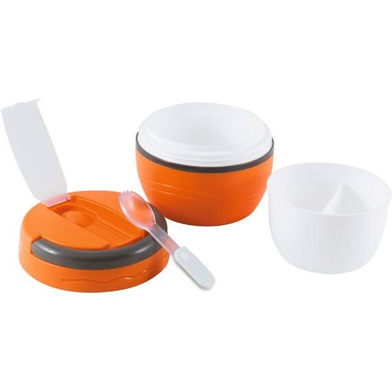 Емкость 0,5 л. Материал: пластмасса - Двойные вакуумные пластиковые стенки, пространство между стенками заполнено теплоизоляционной пеной. - Внутри пластиковая емкость, разделенная на 2 отделения, благодаря чему термос можно использовать для нескольких блюд одновременно. - Не подходит для первых блюд. - В комплект также входит ложка, вложенная в отделение на крышке термоса. - Ширина горла 14,5 см Упаковка: вкладыш + термоусадка