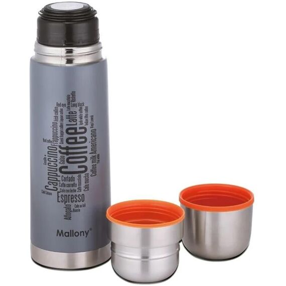 Колба и корпус из нержавеющей стали с двойными стенками. Герметичный клапан (пробка) с кнопкой. В комплекте 2 чашки. Упаковка - картонная коробка