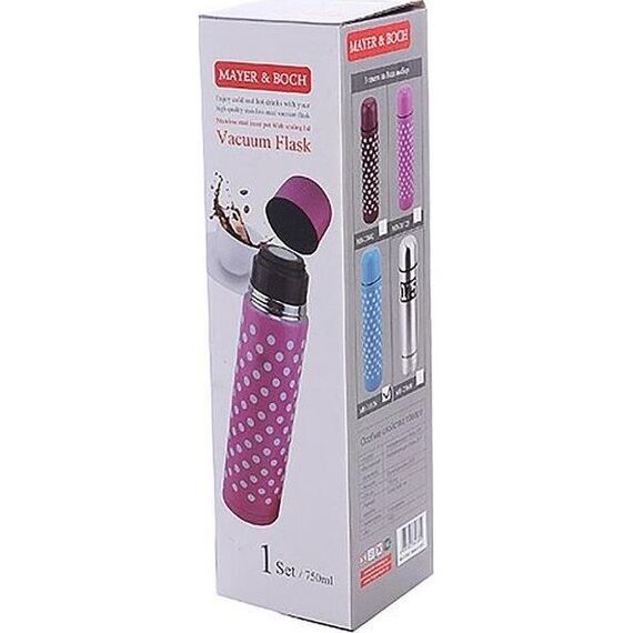 ТермосMAYER&BOCH выполнен из качественной нержавеющей стали, которая не вступает в реакцию с содержимым термоса и не изменяет вкусовых качеств напитка. Двойная стенка из нержавеющей стали сохраняет температуру на срок до 6-ти часов. Вакуумный закручивающийся клапан предохраняет от проливаний. Цветное покрытие обеспечивает защиту от истирания корпуса. Данная модель термоса прочная, долговечная и в тоже время легкая. Стильный металлический термос понравится абсолютно всем и впишется в любой интерьер кухни. Легко и просто моется.
