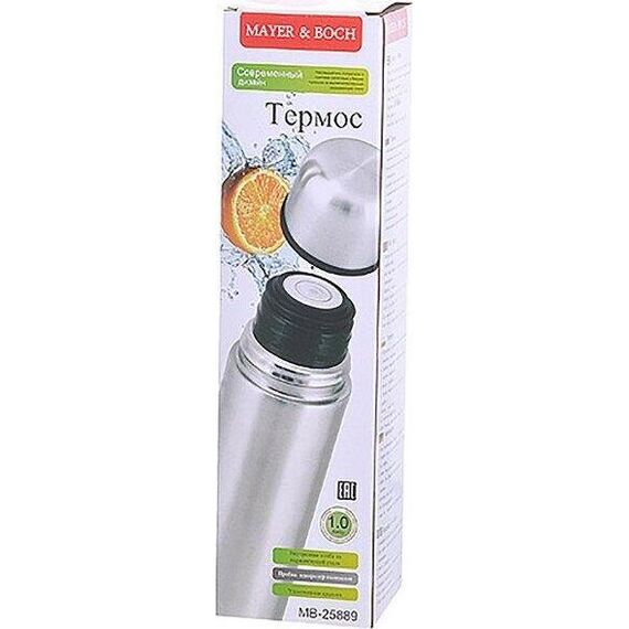 Термос МВ (х24). Корпус: нержавеющая сталь. Внутренняя колба: нержавеющая сталь. Крышка: полипропилен. Цвет: серебристый. Диаметр горлышка: 5 см. Объем: 1 л. Размер упаковки: 8,5 х 8,5 х 33 см. Упаковка: коробка. Вес: 565 г. Страна-изготовитель: Китай.