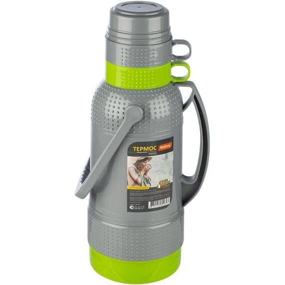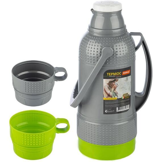 Термос со стеклянной колбой 2 кружки в комплекте Снабжен ручкой для удобства переноски Объем: 3,2 л Размер: 17.5*16.5*44.5 см Сохраняет жидкость горячей до 72часов (возможно отличие при изменении температуры окр среды) Материал: полипропилен, стекло, элементы из силикона