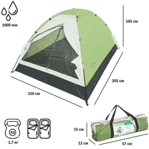 Палатка Green Glade Kenya 2 пригодится на пляже или во время отдыха на природе. Тент защитит от солнечных лучей в жаркий день. Палатка очень компактная и легкая, поэтому ее удобно брать с собой. Сборка происходит буквально за несколько минут. • Размер (ШхДхВ): 205х150х105 см • Внешний тент: 180Т полиэстер • Водяной столб: 1000 мм • Дуги: 7,9 мм фиберглас • Пол: 120 г/м2 полиэтилен • Размер индивидуальной упаковки: 57х15х12 см • Вес нетто: 1,7 кг • Количество штук в коробке: 10 штук • Вес брутто: 17,64 кг • Производитель: Green Glade