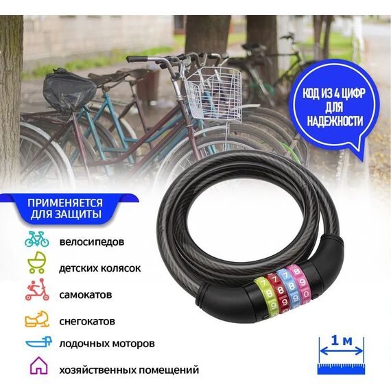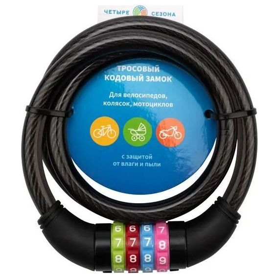 Тросовый кодовый замок ЧЕТЫРЕ СЕЗОНА – недорогое и надежное средство от кражи велосипедов, мопедов, колясок, рекламных щитов, вывесок и другого имущества. Отличается простой конструкцией, удобством транспортировки и высокой степенью стойкости к взлому.; Трос в износостойкой пластиковой оболочке имеет гибкую конструкцию с надежным кодовым замком, позволяющим, при необходимости, менять комбинации, избегая потери ключей, в отличие от моделей со стандартными замками.; Длина замка: 100 см