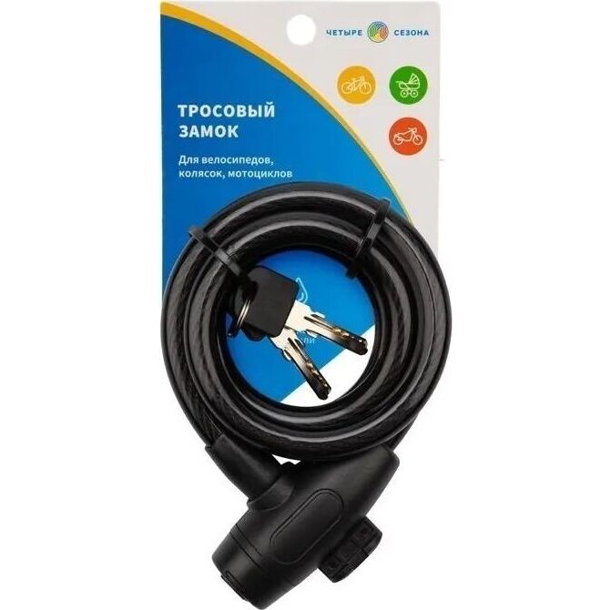 Тросовый замок с ключом ЧЕТЫРЕ СЕЗОНА – недорогое и надежное средство от кражи велосипедов, мопедов, колясок, рекламных щитов, вывесок и другого имущества. Отличается простой конструкцией, удобством транспортировки и высокой степенью стойкости к взлому.; Трос в износостойкой пластиковой оболочке имеет гибкую конструкцию с надежным замком. В комплект входит компактный ключ, который с легкостью помещается в кармане или в кошельке.; Длина замка: 100 см