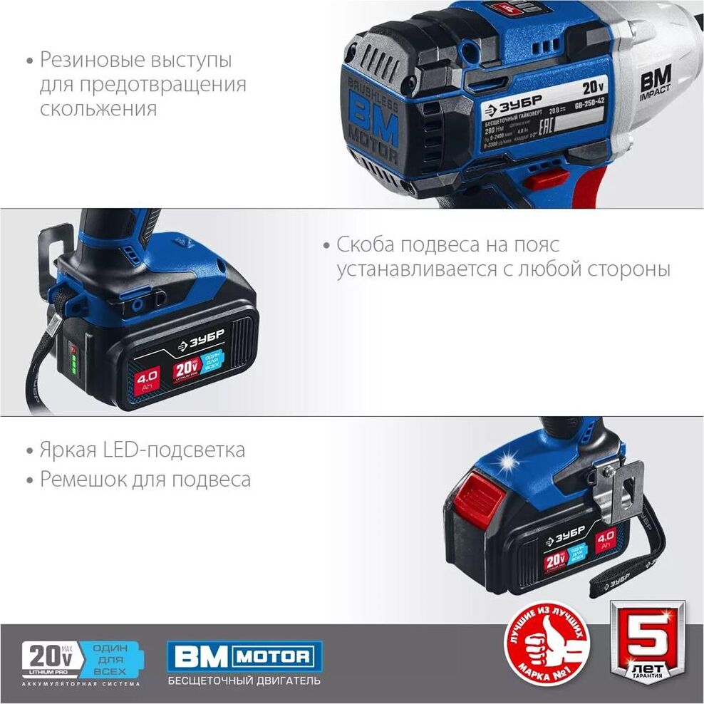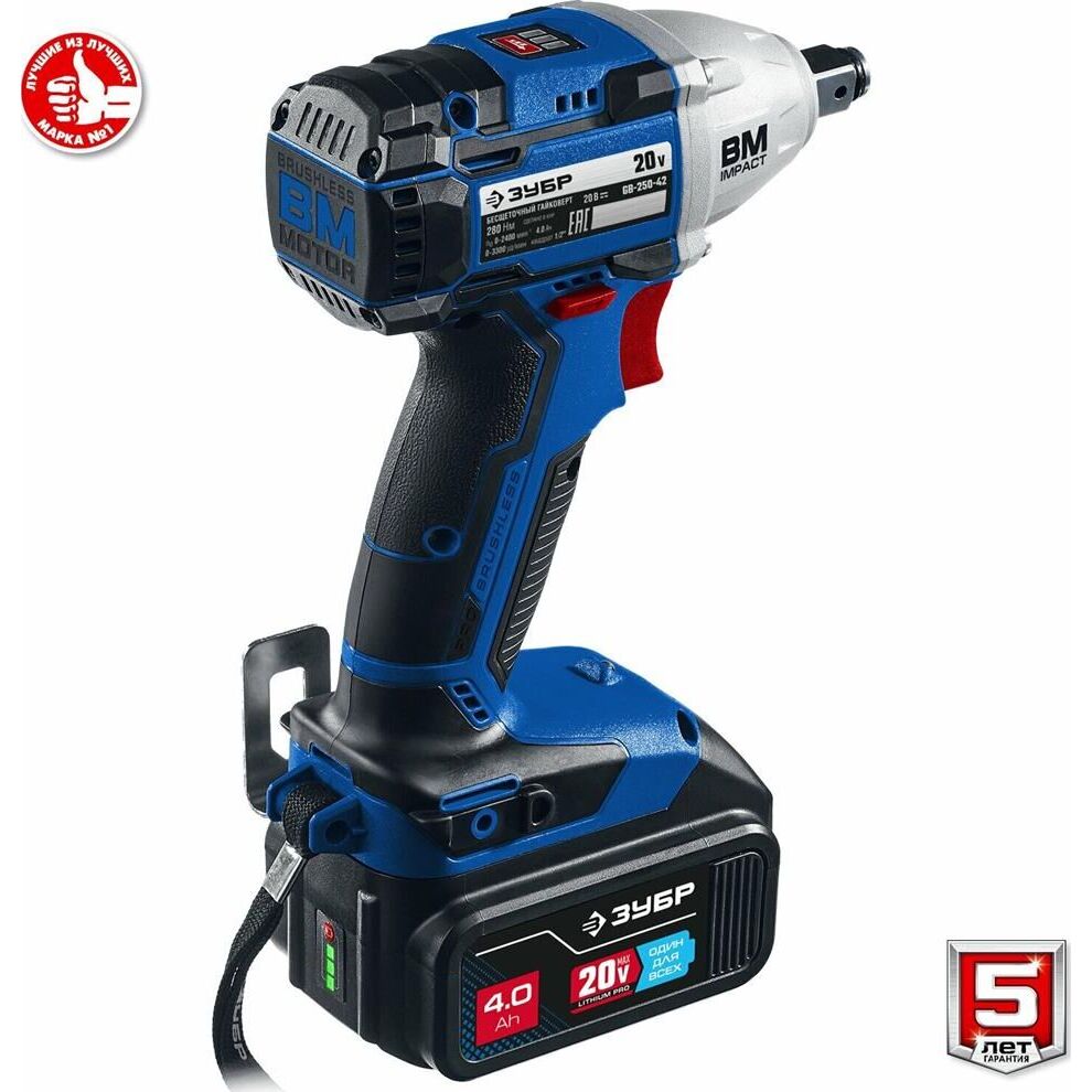 Бесщеточный гайковерт ЗУБР GB-250-42 20В бесщеточный гайковерт, 2 АКБ (4Ач), в кейсе, Профессионал