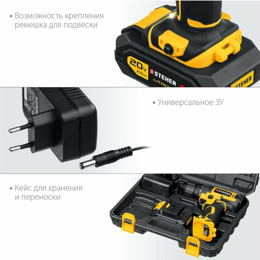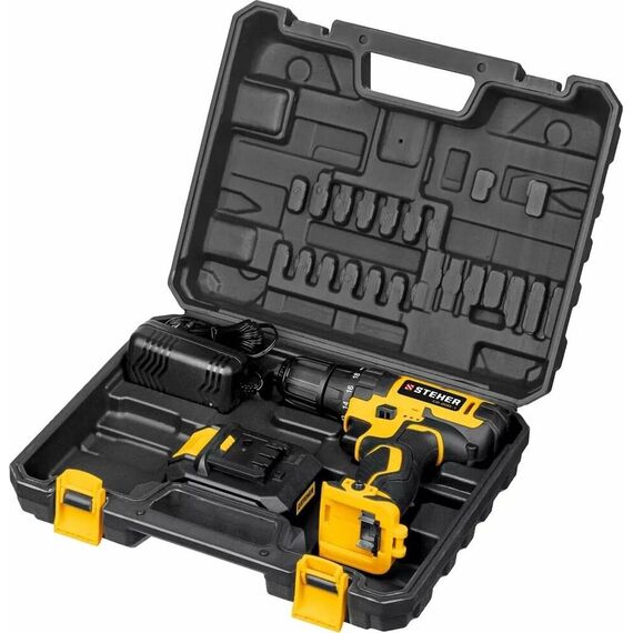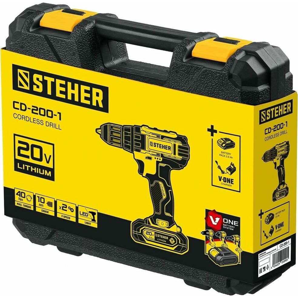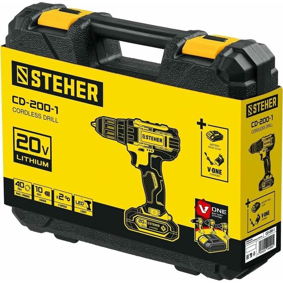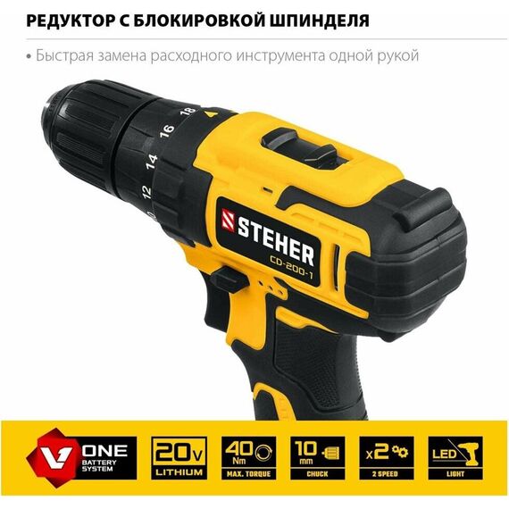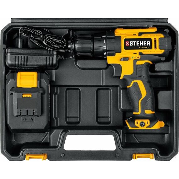 Дрель STEHER CD-200-1 20В, 1 АКБ (2Ач), в кейсе, дрель-шуруповерт
