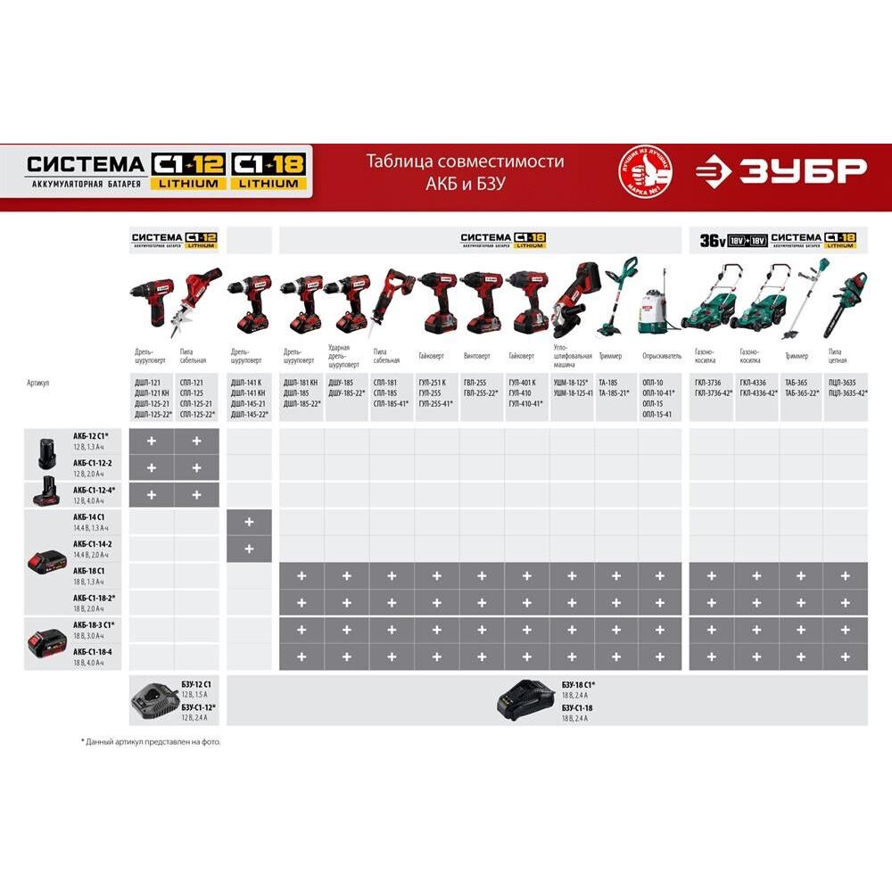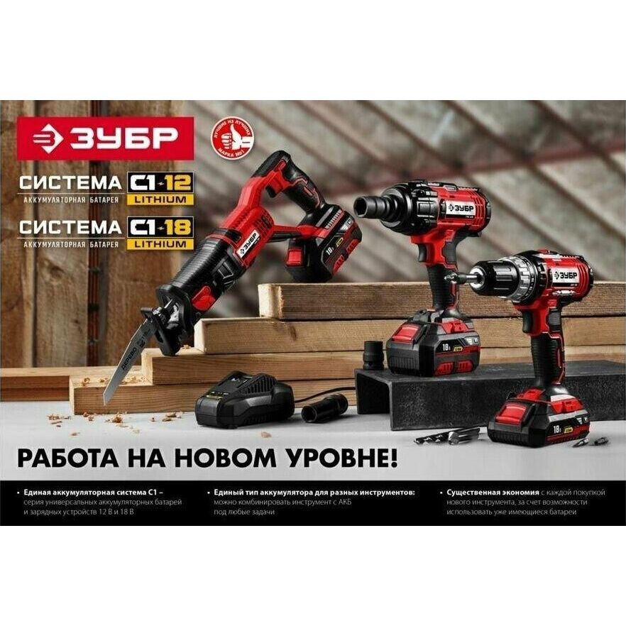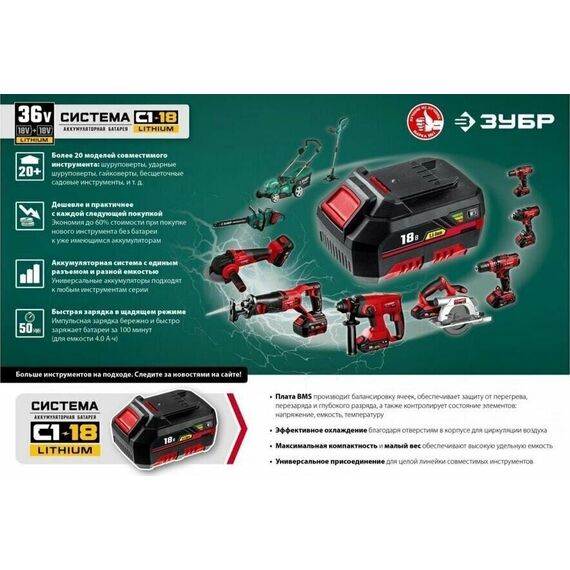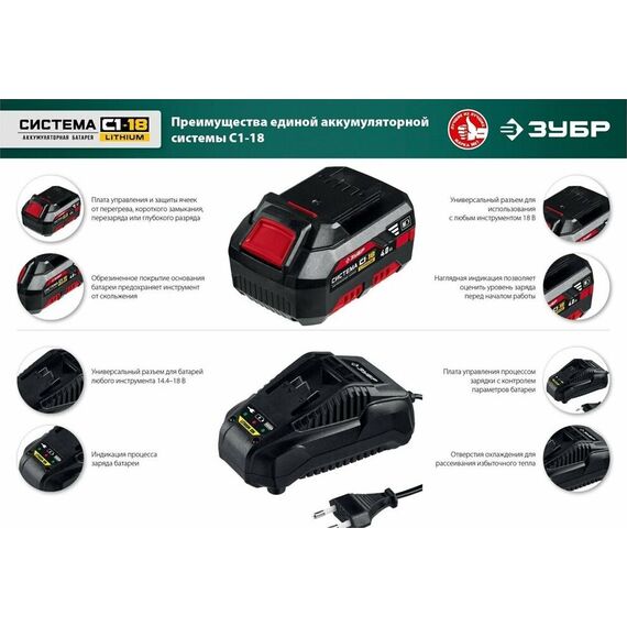Типзарядное устройство Напряжение 18 ВТип аккумулятора Li-Ion Совместимый бренд ЗУБР Конструкция аккумулятора слайдер